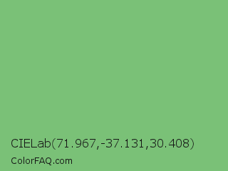 CIELab 71.967,-37.131,30.408 Color is a light green color and the nearest color is Iguana Green #71bc78. Hex code #7ac177 and RGB value is rgb(122,193,119). In RGB color space, this color is composed of 48% red, 76% green, 47% blue, In CMYK color space, this color is composed of 37% cyan, 0% magenta, 38% yellow , 24% black , In HSL color space, this color has a hue angle of 118° , 37% saturation and 61% lightness.
