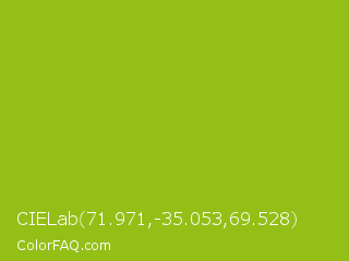 CIELab 71.971,-35.053,69.528 Color is a normal lime color and the nearest color is Pistachio Green #9dc209. Hex code #94bf16 and RGB value is rgb(148,191,22). In RGB color space, this color is composed of 58% red, 75% green, 9% blue, In CMYK color space, this color is composed of 23% cyan, 0% magenta, 88% yellow , 25% black , In HSL color space, this color has a hue angle of 75° , 79% saturation and 42% lightness.