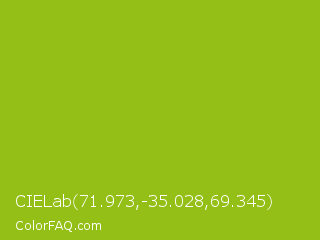 CIELab 71.973,-35.028,69.345 Color is a normal lime color and the nearest color is Pistachio Green #9dc209. Hex code #94bf17 and RGB value is rgb(148,191,23). In RGB color space, this color is composed of 58% red, 75% green, 9% blue, In CMYK color space, this color is composed of 23% cyan, 0% magenta, 88% yellow , 25% black , In HSL color space, this color has a hue angle of 75° , 79% saturation and 42% lightness.