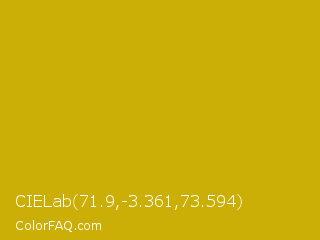 CIELab 71.9,-3.361,73.594 Color is a normal yellow color and the nearest color is Galliano #dcb20c. Hex code #ccaf06 and RGB value is rgb(204,175,6). In RGB color space, this color is composed of 80% red, 69% green, 2% blue, In CMYK color space, this color is composed of 0% cyan, 14% magenta, 97% yellow , 20% black , In HSL color space, this color has a hue angle of 51° , 94% saturation and 41% lightness.