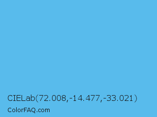 CIELab 72.008,-14.477,-33.021 Color is a light blue color and the nearest color is Blue Jeans #5dadec. Hex code #58bbec and RGB value is rgb(88,187,236). In RGB color space, this color is composed of 35% red, 73% green, 93% blue, In CMYK color space, this color is composed of 63% cyan, 21% magenta, 0% yellow , 7% black , In HSL color space, this color has a hue angle of 200° , 80% saturation and 64% lightness.