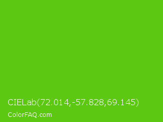 CIELab 72.014,-57.828,69.145 Color is a normal green color and the nearest color is Kelly Green #4cbb17. Hex code #5dc812 and RGB value is rgb(93,200,18). In RGB color space, this color is composed of 36% red, 78% green, 7% blue, In CMYK color space, this color is composed of 54% cyan, 0% magenta, 91% yellow , 22% black , In HSL color space, this color has a hue angle of 95° , 83% saturation and 43% lightness.