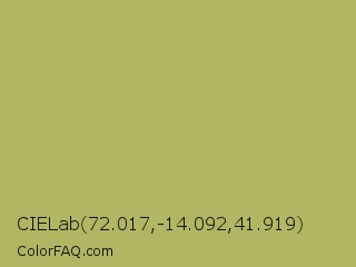 CIELab 72.017,-14.092,41.919 Color is a normal yellow color and the nearest color is Olive Green #b5b35c. Hex code #b1b662 and RGB value is rgb(177,182,98). In RGB color space, this color is composed of 69% red, 71% green, 38% blue, In CMYK color space, this color is composed of 3% cyan, 0% magenta, 46% yellow , 29% black , In HSL color space, this color has a hue angle of 64° , 37% saturation and 55% lightness.