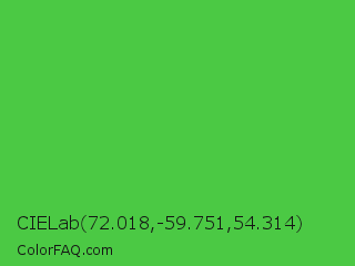 CIELab 72.018,-59.751,54.314 Color is a normal green color and the nearest color is Lime Green #32cd32. Hex code #4bc944 and RGB value is rgb(75,201,68). In RGB color space, this color is composed of 29% red, 79% green, 27% blue, In CMYK color space, this color is composed of 63% cyan, 0% magenta, 66% yellow , 21% black , In HSL color space, this color has a hue angle of 117° , 55% saturation and 53% lightness.