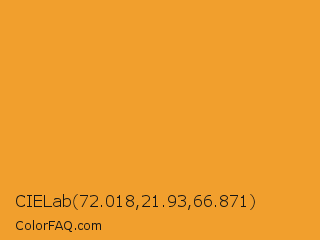 CIELab 72.018,21.93,66.871 Color is a normal orange color and the nearest color is Sea Buckthorn #fba129. Hex code #f19f2d and RGB value is rgb(241,159,45). In RGB color space, this color is composed of 95% red, 62% green, 18% blue, In CMYK color space, this color is composed of 0% cyan, 34% magenta, 81% yellow , 5% black , In HSL color space, this color has a hue angle of 35° , 88% saturation and 56% lightness.