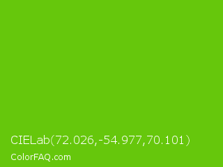 CIELab 72.026,-54.977,70.101 Color is a normal green color and the nearest color is Lima #76bd17. Hex code #66c70c and RGB value is rgb(102,199,12). In RGB color space, this color is composed of 40% red, 78% green, 5% blue, In CMYK color space, this color is composed of 49% cyan, 0% magenta, 94% yellow , 22% black , In HSL color space, this color has a hue angle of 91° , 89% saturation and 41% lightness.