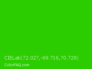 CIELab 72.027,-69.716,70.729 Color is a normal green color and the nearest color is Harlequin Green #46cb18. Hex code #2bcc00 and RGB value is rgb(43,204,0). In RGB color space, this color is composed of 17% red, 80% green, 0% blue, In CMYK color space, this color is composed of 79% cyan, 0% magenta, 100% yellow , 20% black , In HSL color space, this color has a hue angle of 107° , 100% saturation and 40% lightness.