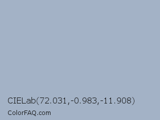 CIELab 72.031,-0.983,-11.908 Color is a light blue color and the nearest color is Cadet Blue #a9b2c3. Hex code #a3b2c6 and RGB value is rgb(163,178,198). In RGB color space, this color is composed of 64% red, 70% green, 78% blue, In CMYK color space, this color is composed of 18% cyan, 10% magenta, 0% yellow , 22% black , In HSL color space, this color has a hue angle of 214° , 23% saturation and 71% lightness.