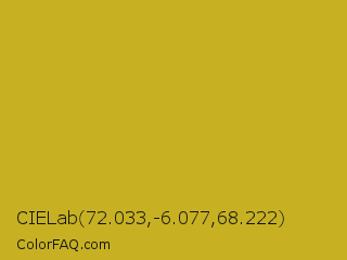 CIELab 72.033,-6.077,68.222 Color is a normal yellow color and the nearest color is Hokey Pokey #c8a528. Hex code #c7b123 and RGB value is rgb(199,177,35). In RGB color space, this color is composed of 78% red, 69% green, 14% blue, In CMYK color space, this color is composed of 0% cyan, 11% magenta, 82% yellow , 22% black , In HSL color space, this color has a hue angle of 52° , 70% saturation and 46% lightness.
