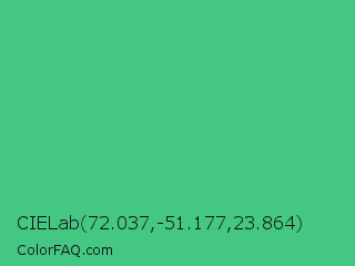 CIELab 72.037,-51.177,23.864 Color is a normal green color and the nearest color is Emerald #50c878. Hex code #44c783 and RGB value is rgb(68,199,131). In RGB color space, this color is composed of 27% red, 78% green, 51% blue, In CMYK color space, this color is composed of 66% cyan, 0% magenta, 34% yellow , 22% black , In HSL color space, this color has a hue angle of 149° , 54% saturation and 52% lightness.
