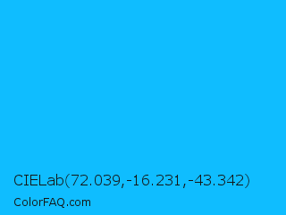 CIELab 72.039,-16.231,-43.342 Color is a normal blue color and the nearest color is Spiro Disco Ball #0fc0fc. Hex code #0fbdff and RGB value is rgb(15,189,255). In RGB color space, this color is composed of 6% red, 74% green, 100% blue, In CMYK color space, this color is composed of 94% cyan, 26% magenta, 0% yellow , 0% black , In HSL color space, this color has a hue angle of 197° , 100% saturation and 53% lightness.