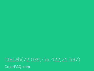 CIELab 72.039,-56.422,21.637 Color is a normal green color and the nearest color is Mountain Meadow Crayola #1ab385. Hex code #18c987 and RGB value is rgb(24,201,135). In RGB color space, this color is composed of 9% red, 79% green, 53% blue, In CMYK color space, this color is composed of 88% cyan, 0% magenta, 33% yellow , 21% black , In HSL color space, this color has a hue angle of 158° , 79% saturation and 44% lightness.