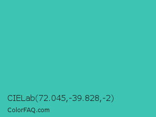 CIELab 72.045,-39.828,-2 Color is a normal cyan color and the nearest color is Puerto Rico #3fc1aa. Hex code #3dc4b3 and RGB value is rgb(61,196,179). In RGB color space, this color is composed of 24% red, 77% green, 70% blue, In CMYK color space, this color is composed of 69% cyan, 0% magenta, 9% yellow , 23% black , In HSL color space, this color has a hue angle of 172° , 53% saturation and 50% lightness.