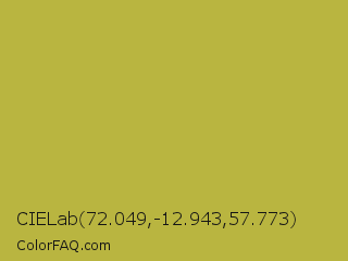 CIELab 72.049,-12.943,57.773 Color is a normal yellow color and the nearest color is Brass #b5a642. Hex code #b9b540 and RGB value is rgb(185,181,64). In RGB color space, this color is composed of 73% red, 71% green, 25% blue, In CMYK color space, this color is composed of 0% cyan, 2% magenta, 65% yellow , 27% black , In HSL color space, this color has a hue angle of 58° , 49% saturation and 49% lightness.