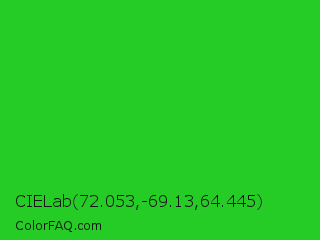 CIELab 72.053,-69.13,64.445 Color is a normal green color and the nearest color is Lime Green #32cd32. Hex code #26cc26 and RGB value is rgb(38,204,38). In RGB color space, this color is composed of 15% red, 80% green, 15% blue, In CMYK color space, this color is composed of 81% cyan, 0% magenta, 81% yellow , 20% black , In HSL color space, this color has a hue angle of 120° , 69% saturation and 47% lightness.