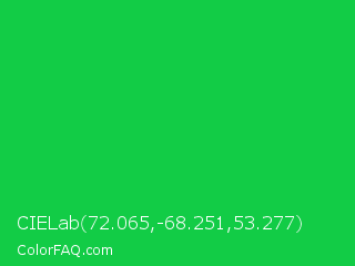CIELab 72.065,-68.251,53.277 Color is a normal green color and the nearest color is Malachite #0bda51. Hex code #12cc46 and RGB value is rgb(18,204,70). In RGB color space, this color is composed of 7% red, 80% green, 27% blue, In CMYK color space, this color is composed of 91% cyan, 0% magenta, 66% yellow , 20% black , In HSL color space, this color has a hue angle of 137° , 84% saturation and 44% lightness.