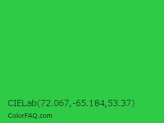 CIELab 72.067,-65.184,53.37 Color is a normal green color and the nearest color is Lime Green #32cd32. Hex code #2fcb46 and RGB value is rgb(47,203,70). In RGB color space, this color is composed of 18% red, 80% green, 27% blue, In CMYK color space, this color is composed of 77% cyan, 0% magenta, 66% yellow , 20% black , In HSL color space, this color has a hue angle of 129° , 62% saturation and 49% lightness.