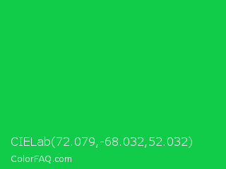 CIELab 72.079,-68.032,52.032 Color is a normal green color and the nearest color is Malachite #0bda51. Hex code #10cc49 and RGB value is rgb(16,204,73). In RGB color space, this color is composed of 6% red, 80% green, 29% blue, In CMYK color space, this color is composed of 92% cyan, 0% magenta, 64% yellow , 20% black , In HSL color space, this color has a hue angle of 138° , 85% saturation and 43% lightness.