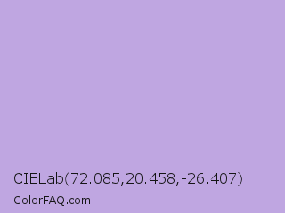 CIELab 72.085,20.458,-26.407 Color is a light violet color and the nearest color is Light Wisteria #c9a0dc. Hex code #bfa6e1 and RGB value is rgb(191,166,225). In RGB color space, this color is composed of 75% red, 65% green, 88% blue, In CMYK color space, this color is composed of 15% cyan, 26% magenta, 0% yellow , 12% black , In HSL color space, this color has a hue angle of 265° , 50% saturation and 77% lightness.
