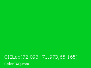 CIELab 72.093,-71.973,65.165 Color is a normal green color and the nearest color is Vivid Malachite #00cc33. Hex code #02cd23 and RGB value is rgb(2,205,35). In RGB color space, this color is composed of 1% red, 80% green, 14% blue, In CMYK color space, this color is composed of 99% cyan, 0% magenta, 83% yellow , 20% black , In HSL color space, this color has a hue angle of 130° , 98% saturation and 41% lightness.