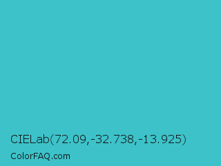CIELab 72.09,-32.738,-13.925 Color is a normal cyan color and the nearest color is Sea Serpent #4bc7cf. Hex code #3dc2c9 and RGB value is rgb(61,194,201). In RGB color space, this color is composed of 24% red, 76% green, 79% blue, In CMYK color space, this color is composed of 70% cyan, 3% magenta, 0% yellow , 21% black , In HSL color space, this color has a hue angle of 183° , 56% saturation and 51% lightness.