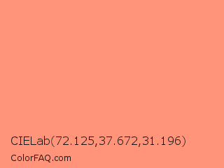 CIELab 72.125,37.672,31.196 Color is a light red color and the nearest color is Vivid Tangerine #ff9980. Hex code #ff947a and RGB value is rgb(255,148,122). In RGB color space, this color is composed of 100% red, 58% green, 48% blue, In CMYK color space, this color is composed of 0% cyan, 42% magenta, 52% yellow , 0% black , In HSL color space, this color has a hue angle of 12° , 100% saturation and 74% lightness.