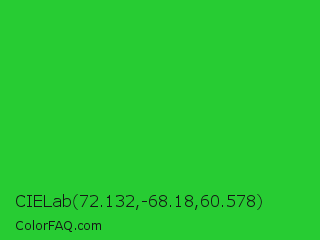 CIELab 72.132,-68.18,60.578 Color is a normal green color and the nearest color is Lime Green #32cd32. Hex code #27cc33 and RGB value is rgb(39,204,51). In RGB color space, this color is composed of 15% red, 80% green, 20% blue, In CMYK color space, this color is composed of 81% cyan, 0% magenta, 75% yellow , 20% black , In HSL color space, this color has a hue angle of 124° , 68% saturation and 48% lightness.