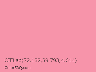 CIELab 72.132,39.793,4.614 Color is a light red color and the nearest color is Pink Sherbet #f78fa7. Hex code #f794aa and RGB value is rgb(247,148,170). In RGB color space, this color is composed of 97% red, 58% green, 67% blue, In CMYK color space, this color is composed of 0% cyan, 40% magenta, 31% yellow , 3% black , In HSL color space, this color has a hue angle of 347° , 86% saturation and 77% lightness.