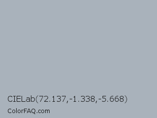 CIELab 72.137,-1.338,-5.668 Color is a light blue color and the nearest color is Bombay #afb1b8. Hex code #a9b2bb and RGB value is rgb(169,178,187). In RGB color space, this color is composed of 66% red, 70% green, 73% blue, In CMYK color space, this color is composed of 10% cyan, 5% magenta, 0% yellow , 27% black , In HSL color space, this color has a hue angle of 210° , 12% saturation and 70% lightness.