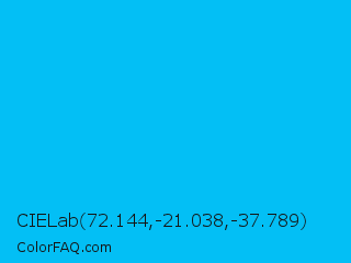 CIELab 72.144,-21.038,-37.789 Color is a normal cyan color and the nearest color is Blue Bolt #00b9fb. Hex code #03bff5 and RGB value is rgb(3,191,245). In RGB color space, this color is composed of 1% red, 75% green, 96% blue, In CMYK color space, this color is composed of 99% cyan, 22% magenta, 0% yellow , 4% black , In HSL color space, this color has a hue angle of 193° , 98% saturation and 49% lightness.