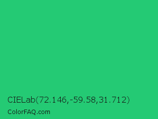 CIELab 72.146,-59.58,31.712 Color is a normal green color and the nearest color is UFO Green #3cd070. Hex code #24ca74 and RGB value is rgb(36,202,116). In RGB color space, this color is composed of 14% red, 79% green, 45% blue, In CMYK color space, this color is composed of 82% cyan, 0% magenta, 43% yellow , 21% black , In HSL color space, this color has a hue angle of 149° , 70% saturation and 47% lightness.