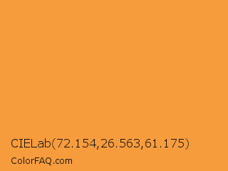 CIELab 72.154,26.563,61.175 Color is a normal orange color and the nearest color is Neon Carrot #ffa343. Hex code #f79c3d and RGB value is rgb(247,156,61). In RGB color space, this color is composed of 97% red, 61% green, 24% blue, In CMYK color space, this color is composed of 0% cyan, 37% magenta, 75% yellow , 3% black , In HSL color space, this color has a hue angle of 31° , 92% saturation and 60% lightness.