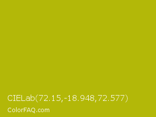 CIELab 72.15,-18.948,72.577 Color is a normal yellow color and the nearest color is La Rioja #b3c110. Hex code #b3b808 and RGB value is rgb(179,184,8). In RGB color space, this color is composed of 70% red, 72% green, 3% blue, In CMYK color space, this color is composed of 3% cyan, 0% magenta, 96% yellow , 28% black , In HSL color space, this color has a hue angle of 62° , 92% saturation and 38% lightness.
