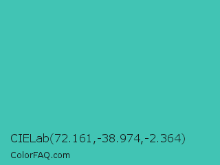 CIELab 72.161,-38.974,-2.364 Color is a normal cyan color and the nearest color is Puerto Rico #3fc1aa. Hex code #41c4b4 and RGB value is rgb(65,196,180). In RGB color space, this color is composed of 25% red, 77% green, 71% blue, In CMYK color space, this color is composed of 67% cyan, 0% magenta, 8% yellow , 23% black , In HSL color space, this color has a hue angle of 173° , 53% saturation and 51% lightness.