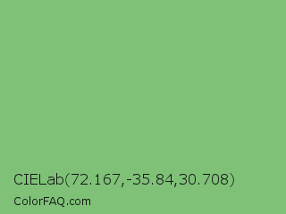 CIELab 72.167,-35.84,30.708 Color is a light green color and the nearest color is Iguana Green #71bc78. Hex code #7ec177 and RGB value is rgb(126,193,119). In RGB color space, this color is composed of 49% red, 76% green, 47% blue, In CMYK color space, this color is composed of 35% cyan, 0% magenta, 38% yellow , 24% black , In HSL color space, this color has a hue angle of 114° , 37% saturation and 61% lightness.