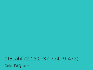 CIELab 72.169,-37.754,-9.475 Color is a normal cyan color and the nearest color is Maximum Blue Green #30bfbf. Hex code #2ec4c1 and RGB value is rgb(46,196,193). In RGB color space, this color is composed of 18% red, 77% green, 76% blue, In CMYK color space, this color is composed of 77% cyan, 0% magenta, 2% yellow , 23% black , In HSL color space, this color has a hue angle of 179° , 62% saturation and 47% lightness.