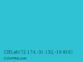 CIELab 72.174,-31.132,-19.816 Color is a normal cyan color and the nearest color is Scooter #2ebfd4. Hex code #2ec2d4 and RGB value is rgb(46,194,212). In RGB color space, this color is composed of 18% red, 76% green, 83% blue, In CMYK color space, this color is composed of 78% cyan, 8% magenta, 0% yellow , 17% black , In HSL color space, this color has a hue angle of 187° , 66% saturation and 51% lightness.