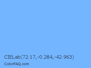 CIELab 72.17,-0.284,-42.963 Color is a light blue color and the nearest color is French Sky Blue #77b5fe. Hex code #73b5ff and RGB value is rgb(115,181,255). In RGB color space, this color is composed of 45% red, 71% green, 100% blue, In CMYK color space, this color is composed of 55% cyan, 29% magenta, 0% yellow , 0% black , In HSL color space, this color has a hue angle of 212° , 100% saturation and 73% lightness.