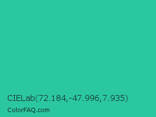 CIELab 72.184,-47.996,7.935 Color is a normal cyan color and the nearest color is Shamrock #33cc99. Hex code #2bc7a1 and RGB value is rgb(43,199,161). In RGB color space, this color is composed of 17% red, 78% green, 63% blue, In CMYK color space, this color is composed of 78% cyan, 0% magenta, 19% yellow , 22% black , In HSL color space, this color has a hue angle of 165° , 64% saturation and 47% lightness.