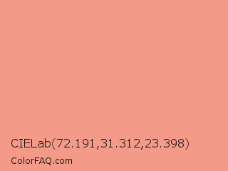CIELab 72.191,31.312,23.398 Color is a light red color and the nearest color is Vivid Tangerine #ffa089. Hex code #f39a88 and RGB value is rgb(243,154,136). In RGB color space, this color is composed of 95% red, 60% green, 53% blue, In CMYK color space, this color is composed of 0% cyan, 37% magenta, 44% yellow , 5% black , In HSL color space, this color has a hue angle of 10° , 82% saturation and 74% lightness.