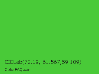 CIELab 72.19,-61.567,59.109 Color is a normal green color and the nearest color is Lime Green #32cd32. Hex code #49ca38 and RGB value is rgb(73,202,56). In RGB color space, this color is composed of 29% red, 79% green, 22% blue, In CMYK color space, this color is composed of 64% cyan, 0% magenta, 72% yellow , 21% black , In HSL color space, this color has a hue angle of 113° , 58% saturation and 51% lightness.