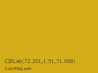 CIELab 72.201,1.51,71.068 Color is a normal yellow color and the nearest color is Golden Grass #daa520. Hex code #d4ad1a and RGB value is rgb(212,173,26). In RGB color space, this color is composed of 83% red, 68% green, 10% blue, In CMYK color space, this color is composed of 0% cyan, 18% magenta, 88% yellow , 17% black , In HSL color space, this color has a hue angle of 47° , 78% saturation and 47% lightness.