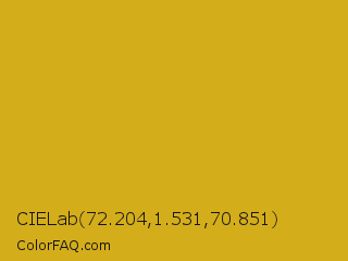 CIELab 72.204,1.531,70.851 Color is a normal yellow color and the nearest color is Golden Grass #daa520. Hex code #d4ad1b and RGB value is rgb(212,173,27). In RGB color space, this color is composed of 83% red, 68% green, 11% blue, In CMYK color space, this color is composed of 0% cyan, 18% magenta, 87% yellow , 17% black , In HSL color space, this color has a hue angle of 47° , 77% saturation and 47% lightness.