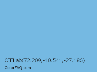 CIELab 72.209,-10.541,-27.186 Color is a light blue color and the nearest color is Aero #7cb9e8. Hex code #75b9e2 and RGB value is rgb(117,185,226). In RGB color space, this color is composed of 46% red, 73% green, 89% blue, In CMYK color space, this color is composed of 48% cyan, 18% magenta, 0% yellow , 11% black , In HSL color space, this color has a hue angle of 203° , 65% saturation and 67% lightness.