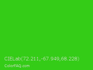 CIELab 72.211,-67.949,68.228 Color is a normal green color and the nearest color is Harlequin Green #46cb18. Hex code #34cc16 and RGB value is rgb(52,204,22). In RGB color space, this color is composed of 20% red, 80% green, 9% blue, In CMYK color space, this color is composed of 75% cyan, 0% magenta, 89% yellow , 20% black , In HSL color space, this color has a hue angle of 110° , 81% saturation and 44% lightness.