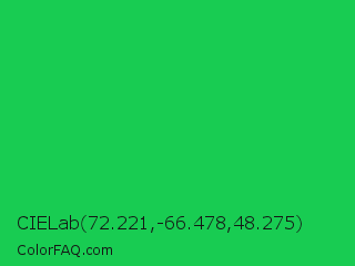 CIELab 72.221,-66.478,48.275 Color is a normal green color and the nearest color is Malachite #0bda51. Hex code #18cc52 and RGB value is rgb(24,204,82). In RGB color space, this color is composed of 9% red, 80% green, 32% blue, In CMYK color space, this color is composed of 88% cyan, 0% magenta, 60% yellow , 20% black , In HSL color space, this color has a hue angle of 139° , 79% saturation and 45% lightness.