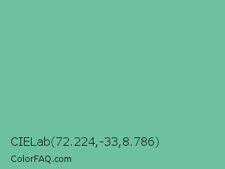 CIELab 72.224,-33,8.786 Color is a normal green color and the nearest color is Green Sheen #6eaea1. Hex code #6ec1a0 and RGB value is rgb(110,193,160). In RGB color space, this color is composed of 43% red, 76% green, 63% blue, In CMYK color space, this color is composed of 43% cyan, 0% magenta, 17% yellow , 24% black , In HSL color space, this color has a hue angle of 156° , 40% saturation and 59% lightness.