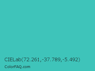 CIELab 72.261,-37.789,-5.492 Color is a normal cyan color and the nearest color is Maximum Blue Green #30bfbf. Hex code #3ec4ba and RGB value is rgb(62,196,186). In RGB color space, this color is composed of 24% red, 77% green, 73% blue, In CMYK color space, this color is composed of 68% cyan, 0% magenta, 5% yellow , 23% black , In HSL color space, this color has a hue angle of 176° , 53% saturation and 51% lightness.