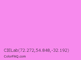 CIELab 72.272,54.848,-32.192 Color is a light magenta color and the nearest color is Light Fuchsia Pink #f984ef. Hex code #f78aed and RGB value is rgb(247,138,237). In RGB color space, this color is composed of 97% red, 54% green, 93% blue, In CMYK color space, this color is composed of 0% cyan, 44% magenta, 4% yellow , 3% black , In HSL color space, this color has a hue angle of 306° , 87% saturation and 75% lightness.