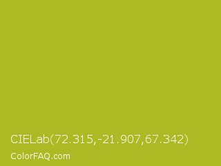 CIELab 72.315,-21.907,67.342 Color is a normal yellow color and the nearest color is Acid Green #b0bf1a. Hex code #adba24 and RGB value is rgb(173,186,36). In RGB color space, this color is composed of 68% red, 73% green, 14% blue, In CMYK color space, this color is composed of 7% cyan, 0% magenta, 81% yellow , 27% black , In HSL color space, this color has a hue angle of 65° , 68% saturation and 44% lightness.